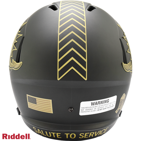 The 2025 NFL Salute to Service helmets are inspired by those used by the military for decades and are meant to honor the memory and selfless sacrifices of service members past and present. Each helmet is painted in a dark green satin finish with black appointments and dark gray face mask. The matte tonal decals match the official 2025 Salute to Service design elements and colorway. A chevron stripe pattern is used on every helmet, along with city name abbreviations on front bumpers, and Salute to Service back bumper decals. The helmet includes the official Salute to Service ribbon and a tonal U.S. flag. Made by Riddell.