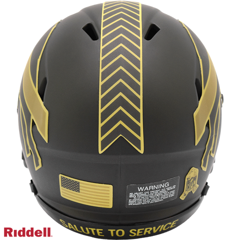 The 2025 NFL Salute to Service helmets are inspired by those used by the military for decades and are meant to honor the memory and selfless sacrifices of service members past and present. Each helmet is painted in a dark green satin finish with black appointments and dark gray face mask. The matte tonal decals match the official 2025 Salute to Service design elements and colorway. A chevron stripe pattern is used on every helmet, along with city name abbreviations on front bumpers, and Salute to Service back bumper decals. The helmet includes the official Salute to Service ribbon and a tonal U.S. flag. Made by Riddell.