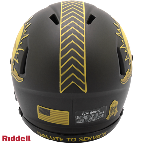 The 2025 NFL Salute to Service helmets are inspired by those used by the military for decades and are meant to honor the memory and selfless sacrifices of service members past and present. Each helmet is painted in a dark green satin finish with black appointments and dark gray face mask. The matte tonal decals match the official 2025 Salute to Service design elements and colorway. A chevron stripe pattern is used on every helmet, along with city name abbreviations on front bumpers, and Salute to Service back bumper decals. The helmet includes the official Salute to Service ribbon and a tonal U.S. flag. Made by Riddell.