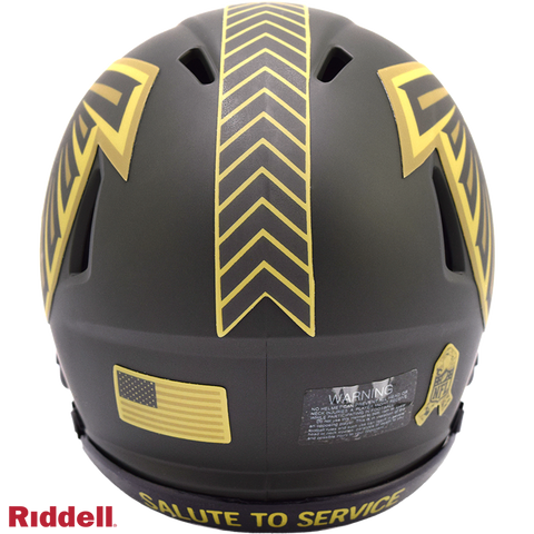 The 2025 NFL Salute to Service helmets are inspired by those used by the military for decades and are meant to honor the memory and selfless sacrifices of service members past and present. Each helmet is painted in a dark green satin finish with black appointments and dark gray face mask. The matte tonal decals match the official 2025 Salute to Service design elements and colorway. A chevron stripe pattern is used on every helmet, along with city name abbreviations on front bumpers, and Salute to Service back bumper decals. The helmet includes the official Salute to Service ribbon and a tonal U.S. flag. Made by Riddell.
