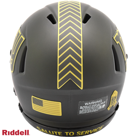 The 2025 NFL Salute to Service helmets are inspired by those used by the military for decades and are meant to honor the memory and selfless sacrifices of service members past and present. Each helmet is painted in a dark green satin finish with black appointments and dark gray face mask. The matte tonal decals match the official 2025 Salute to Service design elements and colorway. A chevron stripe pattern is used on every helmet, along with city name abbreviations on front bumpers, and Salute to Service back bumper decals. The helmet includes the official Salute to Service ribbon and a tonal U.S. flag. Made by Riddell.