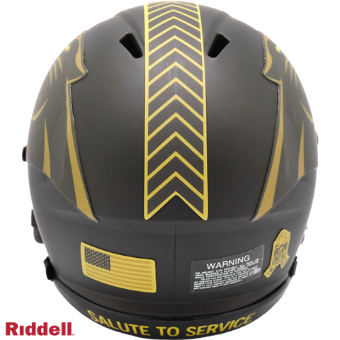 The 2025 NFL Salute to Service helmets are inspired by those used by the military for decades and are meant to honor the memory and selfless sacrifices of service members past and present. Each helmet is painted in a dark green satin finish with black appointments and dark gray face mask. The matte tonal decals match the official 2025 Salute to Service design elements and colorway. A chevron stripe pattern is used on every helmet, along with city name abbreviations on front bumpers, and Salute to Service back bumper decals. The helmet includes the official Salute to Service ribbon and a tonal U.S. flag. Made by Riddell.