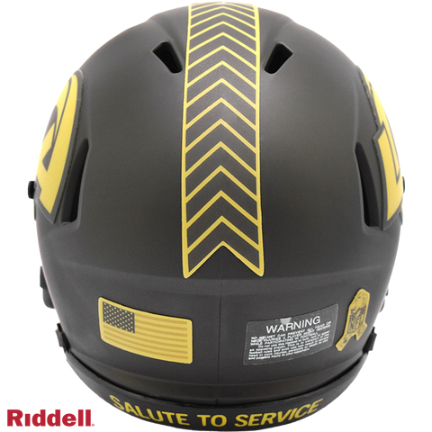 The 2025 NFL Salute to Service helmets are inspired by those used by the military for decades and are meant to honor the memory and selfless sacrifices of service members past and present. Each helmet is painted in a dark green satin finish with black appointments and dark gray face mask. The matte tonal decals match the official 2025 Salute to Service design elements and colorway. A chevron stripe pattern is used on every helmet, along with city name abbreviations on front bumpers, and Salute to Service back bumper decals. The helmet includes the official Salute to Service ribbon and a tonal U.S. flag. Made by Riddell.