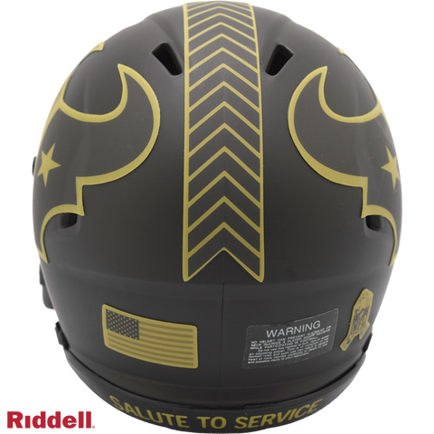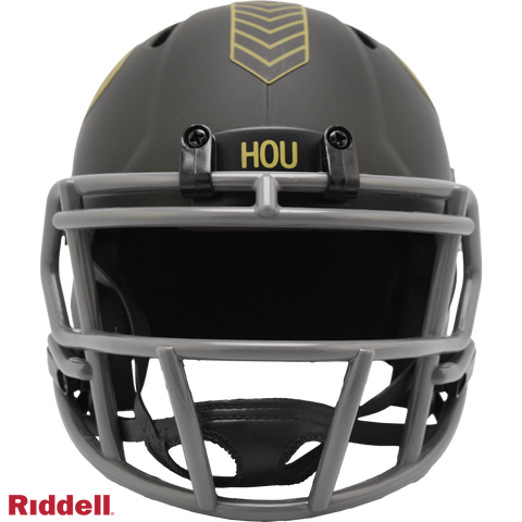 The 2025 NFL Salute to Service helmets are inspired by those used by the military for decades and are meant to honor the memory and selfless sacrifices of service members past and present. Each helmet is painted in a dark green satin finish with black appointments and dark gray face mask. The matte tonal decals match the official 2025 Salute to Service design elements and colorway. A chevron stripe pattern is used on every helmet, along with city name abbreviations on front bumpers, and Salute to Service back bumper decals. The helmet includes the official Salute to Service ribbon and a tonal U.S. flag. Made by Riddell.