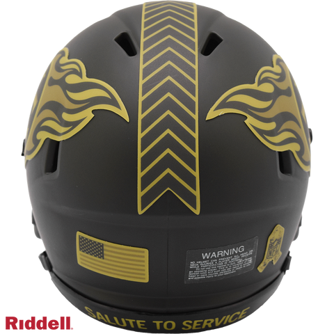 The 2025 NFL Salute to Service helmets are inspired by those used by the military for decades and are meant to honor the memory and selfless sacrifices of service members past and present. Each helmet is painted in a dark green satin finish with black appointments and dark gray face mask. The matte tonal decals match the official 2025 Salute to Service design elements and colorway. A chevron stripe pattern is used on every helmet, along with city name abbreviations on front bumpers, and Salute to Service back bumper decals. The helmet includes the official Salute to Service ribbon and a tonal U.S. flag. Made by Riddell.