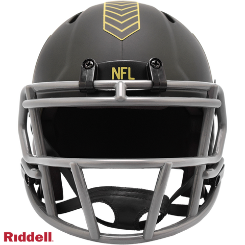 The 2025 NFL Salute to Service helmets are inspired by those used by the military for decades and are meant to honor the memory and selfless sacrifices of service members past and present. Each helmet is painted in a dark green satin finish with black appointments and dark gray face mask. The matte tonal decals match the official 2025 Salute to Service design elements and colorway. A chevron stripe pattern is used on every helmet, along with city name abbreviations on front bumpers, and Salute to Service back bumper decals. The helmet includes the official Salute to Service ribbon and a tonal U.S. flag. Made by Riddell.