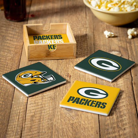 Green Bay Packers Coaster Set 4 Piece with Wood Caddy