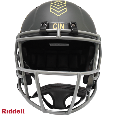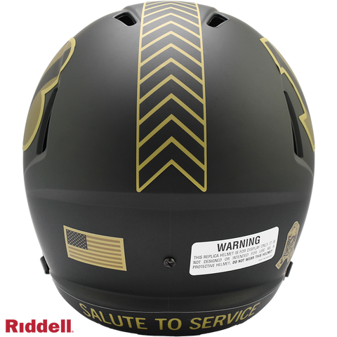 The 2025 NFL Salute to Service helmets are inspired by those used by the military for decades and are meant to honor the memory and selfless sacrifices of service members past and present. Each helmet is painted in a dark green satin finish with black appointments and dark gray face mask. The matte tonal decals match the official 2025 Salute to Service design elements and colorway. A chevron stripe pattern is used on every helmet, along with city name abbreviations on front bumpers, and Salute to Service back bumper decals. The helmet includes the official Salute to Service ribbon and a tonal U.S. flag. Made by Riddell.