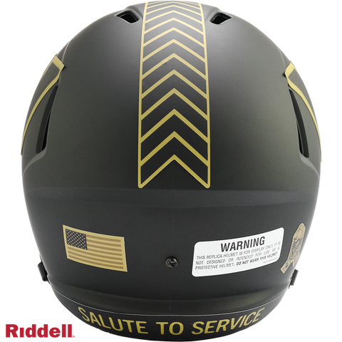 The 2025 NFL Salute to Service helmets are inspired by those used by the military for decades and are meant to honor the memory and selfless sacrifices of service members past and present. Each helmet is painted in a dark green satin finish with black appointments and dark gray face mask. The matte tonal decals match the official 2025 Salute to Service design elements and colorway. A chevron stripe pattern is used on every helmet, along with city name abbreviations on front bumpers, and Salute to Service back bumper decals. The helmet includes the official Salute to Service ribbon and a tonal U.S. flag. Made by Riddell.