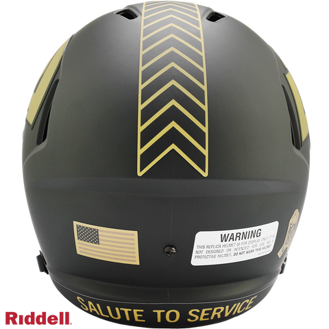 The 2025 NFL Salute to Service helmets are inspired by those used by the military for decades and are meant to honor the memory and selfless sacrifices of service members past and present. Each helmet is painted in a dark green satin finish with black appointments and dark gray face mask. The matte tonal decals match the official 2025 Salute to Service design elements and colorway. A chevron stripe pattern is used on every helmet, along with city name abbreviations on front bumpers, and Salute to Service back bumper decals. The helmet includes the official Salute to Service ribbon and a tonal U.S. flag. Made by Riddell.